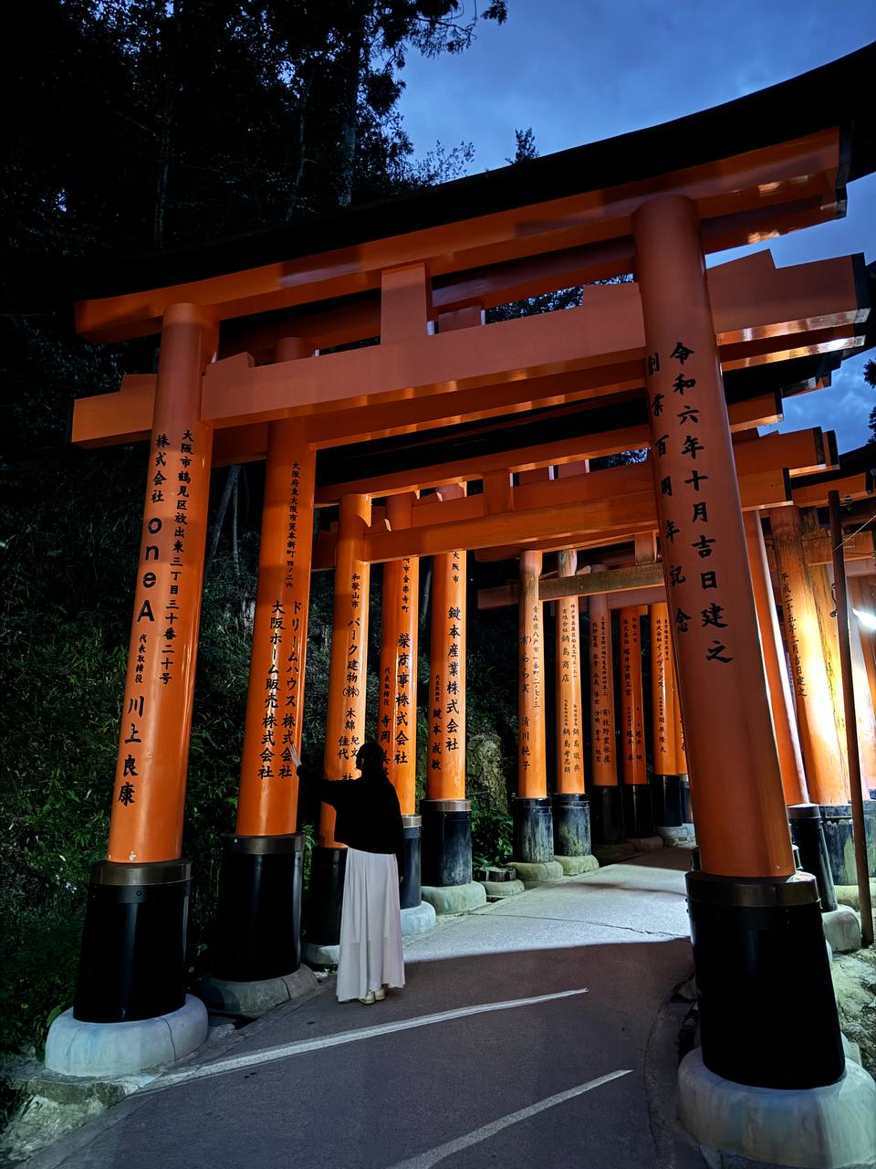 Я переживал, что мы приехали поздно, но это оказалось лучшим вариантом. Некоторые места в Японии надо посещать вечером, когда солнце уже зашло, Фусими-Инари был одним из таких. Дорога из тысячи врат богини Инари, вокруг темнота и лишь огоньки фонарей создают и без того притягательную атмосферу. Невероятное зрелище, мощная энергетика пропитывает все эти место, связывая тебя с ним. Восхождение было нелегким, сотни и сотни лестниц по кольцу до самого верха. Мы смогли дойти и спокойно выбраться назад, это удается немногим, наверху едва ли было больше 10 человек, поэтому мы большие молодцы